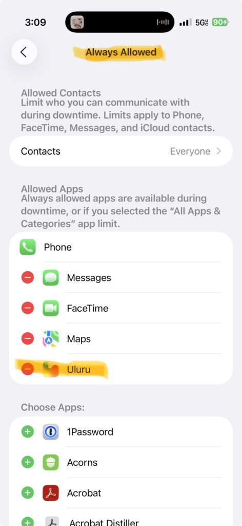 iii. Go to Always Allowed. Find Uluru and tap the plus sign to add it to the Allowed Apps list. You may also want to include other educational apps your child uses.