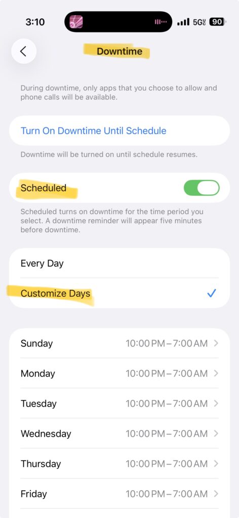 iii. Select Every Day or Customize Days, then set homework start and end times.